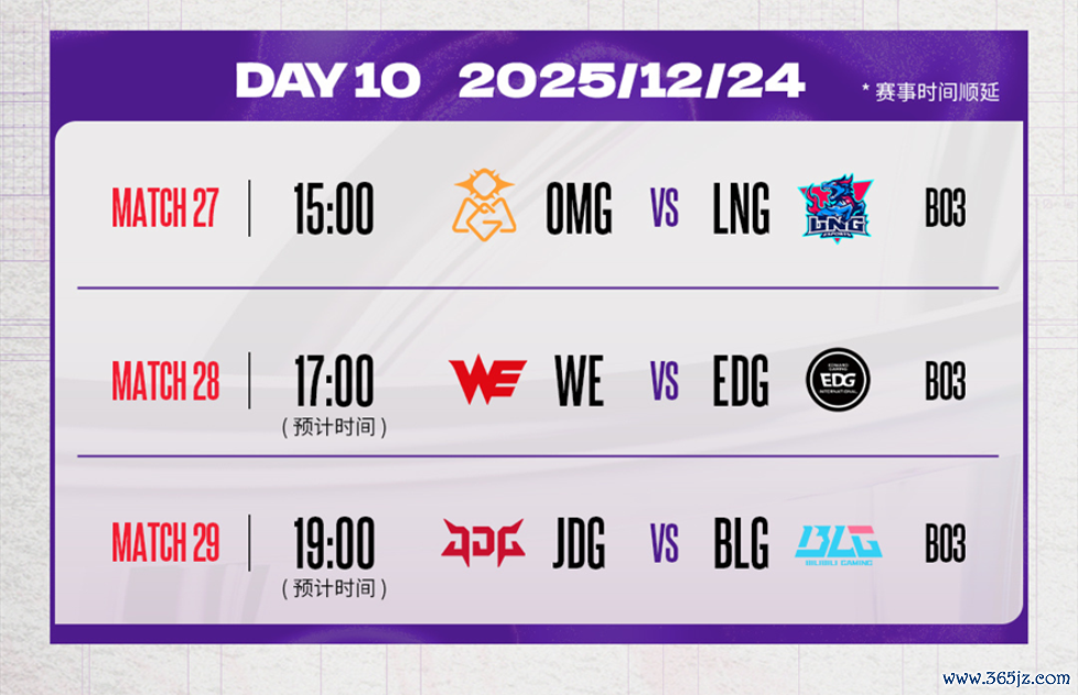 12月24日,三场比赛由OMG对阵LNG,WE对阵EDG,以及重头戏JDG对阵BLG带来。他们谁又会笑到终末呢,让咱们静瞻念其变。